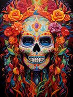 Een suikerschedel is een decoratieve schedelafbeelding die vaak wordt geassocieerd met Dia de los Muertos. Het is een rijkelijk versierde schedel die oorspronkelijk werd gemaakt van suiker of glazuur en diende als symbool van de dood en de overledene. Suikerschedels zijn echter niet alleen symbolen van de dood, maar ook van het leven. Ze zijn vaak kleurrijk en vrolijk om de schoonheid en diversiteit van de natuur, de intelligentie en creativiteit van mensen en de verbinding tussen verleden en heden te tonen. Ze zijn een uiting van respect en liefde voor hen die niet meer onder ons zijn, maar nog wel in ons hart leven. Deze Art-Skull met blauwe ogen zit ook vol levensvreugde.