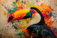 Een prachtige toekan met een felgekleurde snavel die eruitziet als een kunstwerk staat centraal in de compositie. Zijn stralende blauw en het levendige kleurenspel op de achtergrond brengen de tropen tot leven. De kleuren borrelen letterlijk en geven de indruk dat de natuur hier zelf met een penseel aan de slag is gegaan.