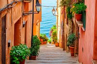 Een schilderachtig pad slingert zachtjes bergafwaarts, omzoomd met bloeiende planten en warme, terracottakleurige muren. Boven de stenen trappen schittert de glinsterende oceaan op de achtergrond, terwijl nostalgische lantaarns het tafereel zachtjes verlichten. Deze plek belooft de ziel te vangen met zijn charme en de rustgevende geluiden van het water.