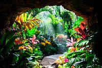 Dit prachtige ontwerp toont een tropisch paradijs vol weelderige planten en kleurrijke bloemen. De zonnestralen die door de bladeren glinsteren creëren een serene en magische sfeer. Het ontwerp straalt levendigheid uit met zijn felle kleuren en overvloedige natuurdetails. Perfect voor liefhebbers van flora en serene landschappen, deze afbeelding past in bijna elke ruimte om een vleugje natuur en rust te brengen. Het is een uitstekende keuze voor zowel interieurdecoratie als inspiratie voor tuinontwerp.