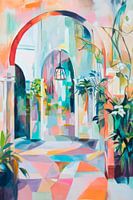 Een levendig spel van kleuren en vormen voert de kijker mee naar een dromerige doorgang waar zachte bogen en delicate planten harmonieus in elkaar overgaan. De kleurrijke tegels weerkaatsen het licht en geven de ruimte een vrolijke sfeer, terwijl een vleugje tropische elegantie in de lucht hangt. Een plek vol mogelijkheden en inspiratie.