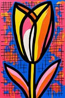 Dit opvallende en levendige ontwerp brengt direct kleur en energie in elke ruimte. De moderne, pop-artstijl maakt gebruik van gedurfde zwarte lijnen en contrasterende kleuren zoals geel, roze, oranje en blauw, wat zorgt voor een visueel aantrekkelijke compositie. De afbeelding van een enkele tulp is eenvoudig maar krachtig, met abstracte en dynamische elementen die het tot een blikvanger maken. Dit kunstwerk is ideaal voor liefhebbers van kleurrijke, moderne kunst en past perfect in een woonkamer, kantoor of andere ruimte waar een statement gemaakt moet worden. Door de levendige kleuren en speelse stijl voegt het direct een vleugje creativiteit en vrolijkheid toe aan elke omgeving.
