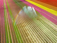 Rode, paarse, oranje en gele tulpen groeien in een landbouwveld in rijen met een irrigatiepistool dat water over de bloemen sproeit in Flevoland, Nederland, tijdens de lente van bovenaf gezien tijdens een mooie lentemiddag. Bloemen zijn een van de belangrijkste exportproducten in Nederland en met name tulpen en tulpenbollen.