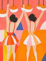 Kleurrijk schilderij van een 2 vrouwen in kleurige jurken die aan het circus doen denken.