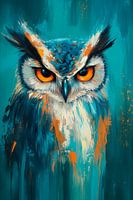 Met zijn heldere, oranje ogen staart de majestueuze vogel uit een zee van krachtig blauw en turkoois. Zijn gevederde verschijning straalt intelligentie en gratie uit, terwijl de dynamische kleurspatten hem een ongewone levendigheid geven. De blik van deze uil lijkt diep in de ziel te kijken, alsof hij de geheimen van de nachtelijke hemel wil onthullen.