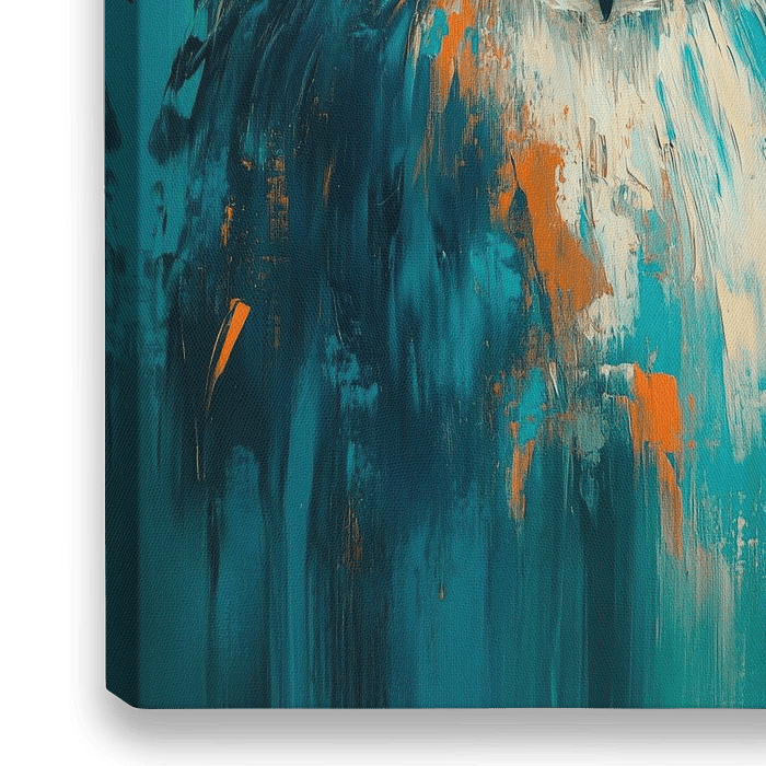 Met zijn heldere, oranje ogen staart de majestueuze vogel uit een zee van krachtig blauw en turkoois. Zijn gevederde verschijning straalt intelligentie en gratie uit, terwijl de dynamische kleurspatten hem een ongewone levendigheid geven. De blik van deze uil lijkt diep in de ziel te kijken, alsof hij de geheimen van de nachtelijke…