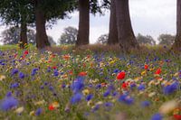 Kleurrijke veldbloemen in de berm onder de eikenbomen. Felle kleuren rood en blauw domineren.