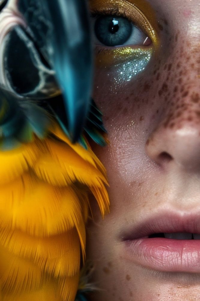 De foto toont een fascinerende band tussen mens en dier. Het brutale, kleurrijke verenkleed van de papegaai staat in schril contrast met de helderblauwe ogen van het meisje en haar natuurlijke huidskleur, die getooid is met sproeten. De gouden oogmake-up creëert een harmonieus effect en versterkt de expressiviteit van dit unieke portret.