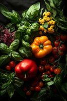 Plekken vol frisheid en kleur getuigen van een culinaire passie. Felrode en gele paprika's, sappige kerstomaatjes en aromatische basilicum ontvouwen hun smaken in een harmonieus samenspel. Deze levendige compositie brengt een prachtige touch in de keuken, waar het dient als inspirerende wanddecoratie om het plezier van koken te inspireren.