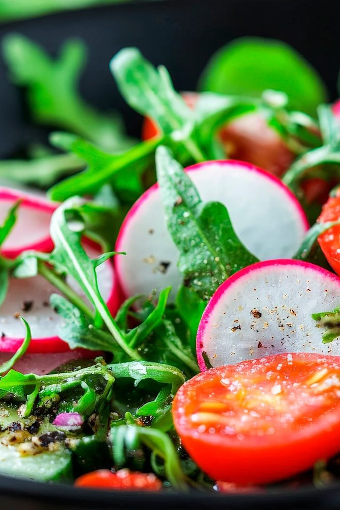 Frisse kleuren en een uitnodigende compositie van knapperige sla, sappige tomaten en malse radijsjes geven deze foto een levendig tintje. Het rustieke houten oppervlak benadrukt de natuurlijke schoonheid van de ingrediënten. Ideaal voor in de keuken, inspireert tot gezonde kookavonturen en roept een warme sfeer op.