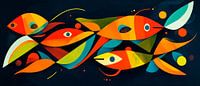 Levendige kleuren dansen in het water, terwijl vrolijke vissen dynamisch door de diepte glijden. Hun unieke vormen en de contrasterende achtergrond roepen een speelse en vermakelijke sfeer op. Dit kunstwerk is ideaal voor de woonkamer en brengt frisse energie en een vleugje maritieme charme in de kamer.