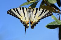Een kleurrijke zwaluwstaart zit op de tak van een olijfboom voor een blauwe hemel.