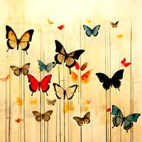 De fragiele schoonheid van vlinders is weergegeven in een dans van kleuren en vormen. De werken tonen een levendige compositie van vlinders die lijken te zweven in de lucht, hun vleugels gespreid in een mozaïek van tinten.