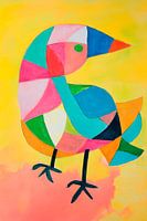 Een geometrische vogel danst over de gele achtergrond in een levendige rel van kleur. De kleurrijke, iriserende vormen harmoniëren in een vrolijk samenspel, terwijl het scherpe oranje van zijn snavel en de delicate pasteltinten van zijn lichaam een betoverend contrast vormen. Deze creatieve afbeelding geeft levenslust en straalt kinderlijke nieuwsgierigheid uit.
