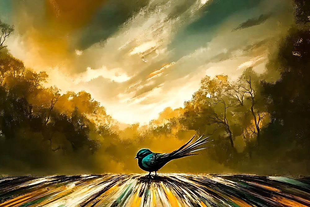Een prachtige surrealistische afbeelding met een kleurrijke vogel die schittert in een abstracte natuurlijke omgeving. De speelse penseelstreken en het dramatische lichtspel maken dit ontwerp uniek en expressief. Perfect voor liefhebbers van kunst die moderne en natuurlijke elementen combineren. Deze print brengt een unieke sfeer in elke ruimte, ideaal om een statement te maken in je interieur.