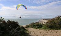 Deze paraglider, met een veelkleurig scherm, geniet van de Zeeuwse kust.
