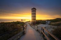Kaapduinen laag, één van de 2 kenmerkende lichtopstanden in Dishoek, staat met zijn gekleurde banden onder een kleurrijke lucht tijdens deze prachtige zonsondergang. Het pad leidt je naar de zee.