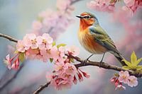 Kleurrijke zangvogel op een bloeiende tak in de lente