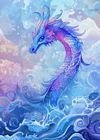 Een fantastisch zeedier met glinsterende schubben en lange, vloeiende vormen komt tevoorschijn uit de golven. De zeedraak is geschilderd in heldere blauwe en paarse tinten en wordt omringd door kolkende waterelementen. Een sprookjesachtig en toch krachtig motief.