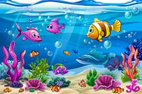 Deze levendige en kleurrijke afbeelding van zeeleven is ideaal om de kinderkamer op te vrolijken. De illustratie toont een speelse onderwaterwereld vol met vrolijke zeedieren zoals kleurrijke vissen, grappige zeesterren, schattige zeepaardjes en levendig koraalrif.