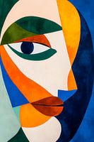 Hier ontvouwt zich een fascinerend spel van kleuren en vormen, waarbij geometrische elementen rond de contouren van een gezicht spelen. De levendige tinten blauw, oranje en groen geven het werk levendigheid en energie. Dit kunstwerk, ideaal voor in de woonkamer, trekt ieders aandacht en zet aan tot nadenken en discussiëren.