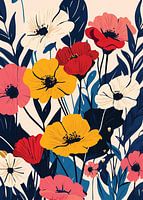 Deze gestileerde afbeelding toont een levendige compositie van verschillende gekleurde zomerbloemen tegen een lichte achtergrond. De bloemen schitteren in levendige tinten geel, rood, roze en crème en contrasteren met de diepblauwe bladeren en stelen. Het harmonieuze arrangement van de bloemen straalt frisheid en lichtheid uit, terwijl de illustratieve stijl van de illustratie een moderne esthetiek creëert. Ideaal voor seizoensdecoraties, bloemenposters of creatieve projecten met een natuurthema.