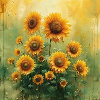 Heldere zonnebloemen op een poster, artistiek weergegeven met een vleugje abstractie en kleurspatten.