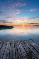 Kleurrijke zonsondergang bij het Balatonmeer aan de zuidkant van het meer met visplatform