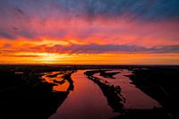 Kleurrijke zonsondergang boven de rivier de IJssel in Overijssel bij Zwolle tijdens de lente gezien van bovenaf. De sterke kleuren in de lucht worden deels veroorzaakt door de zuidenwind die zand uit de Sahara over het Europese continent brengt.
