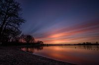 Schilderachtige kleurrijke zonsondergang bij het Binnenmaas-meer, Hoeksche Waard. Wolken zien eruit als geverfd en maken buitengewone reflecties in het meer.