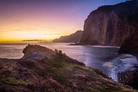 Miradouro do Guindaste op het eiland Madeira bij het krieken van de dag. De kleurenschakeringen in de lucht gaan van een diepblauw over in paars, roze en geel.