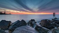 Tijdens het blauwe uurtje op deze prachtige ochtend vindt er een kleurenspektakel plaats boven het IJsselmeer. De opkomende zon doet de wolken in de lucht kleuren van oranje naar paars en blauw. De lange sluitertijd zorgt voor rust in het water, terwijl de stenen op de voorgrond samen met de vuurtoren aan de horizon die de ingang van de…