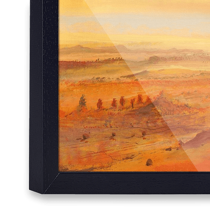 De rotspartij aan de rechterkant van het schilderij, in aards bruin, versterkt het gevoel van warmte en droogte. De bruine bomen,…