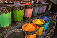 Gekleurd poeder in mooi gekleurde manden. Het kleurrijke poeder wordt gebruikt om kleren te verven in Marrakesh, Marokko.