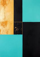 Dit minimalistische, abstracte kunstwerk bestaat uit drie duidelijk afgebakende kleurblokken: turkoois blauw linksonder en rechtsboven, diep zwart in het midden en een gouden vlak ertussen, dat doet denken aan bladgoud. De rangschikking van de kleuren creëert sterke contrasten zonder de visuele harmonie te verstoren.