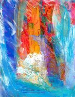 Acrylschilderij, collage en kalligrafie in blauw en rood...