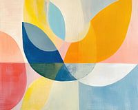 Kleurvlakken - Dit abstract schilderij toont een harmonieuze compositie van overlappende en aan elkaar grenzende vlakken in diverse pasteltinten en enkele diepere kleuren, waaronder blauw en oranje, wat een speels en rustig visueel effect creëert.