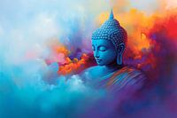 Dit indrukwekkende ontwerp toont een serene Boeddha, omringd door een adembenemend kleurenspel van levendige tinten blauw, oranje en paars. De zachte wolken die de achtergrond sieren, geven het geheel een dromerige, spirituele uitstraling. Perfect als blikvanger in een interieur, brengt het een gevoel van rust, balans en spiritualiteit in elke ruimte. Dit kunstwerk past zowel in moderne als meer traditionele stijlen, ideaal voor slaapkamers of kantoren waar een rustige sfeer gewenst is. Laat deze prachtige compositie je inspireren en innerlijke kalmte brengen.