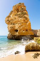 Een grote klif aan de Portugese kust in de Algarve rijst ver boven het helder blauwe water van de zee uit. De golven slaan stuk op het rustige zandstrand.