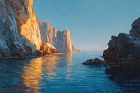 Een olieverfschilderij toont de kliffen van Capri bij zonsopgang, met gouden licht dat weerkaatst op de kalme blauwe zee. Lange schaduwen benadrukken de grillige rotsen, terwijl golven in de verte zachtjes breken tegen de majestueuze kliffen. Een eindeloze zee van azuurblauw strekt zich uit voor de rotsen. De harmonieuze…