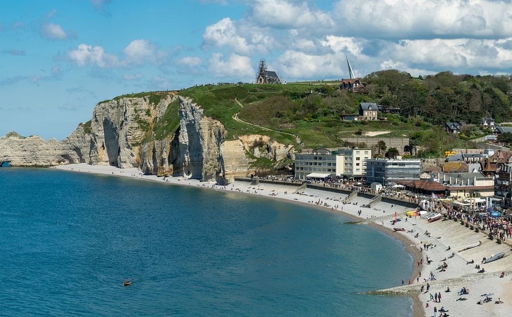 Heerlijk zomers zicht op het mooie en sfeervolle Etretat in Normandie. Deze toeristische trekpleister is altijd erg levendig maar op een mooie zomerse dag nog net iets meer. De kliffen komen mooi boven de stad uit.