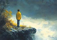 Klifuitzicht | Edge Gazer - Dit schilderij toont een menselijk figuur in een gele jas die op een rotsachtige klif staat met een uitgestrekt uitzicht op een wolkenzee, omgeven door herfstbomen.