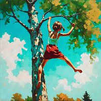 In een levendige weergave van kleur en geest toont het schilderij een jong meisje dat onverschrokken in een boom klimt. Haar kleding is een levendige mix van speelse tinten en weerspiegelt haar avontuurlijke en zorgeloze aard. Haar handen grijpen de stevige takken en haar voeten vinden vakkundig houvast. Haar vastberaden uitdrukking verraadt een onwrikbare vastberadenheid om nieuwe hoogten te bereiken.
