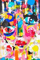 Dit schilderij is geboren uit een explosie van intuïtie en kleur. Ik begon zonder plan, alleen met een stapel olie pastels, dikke klodders verf en resten van mijn palet die ik niet verloren wilde laten gaan. Elk stukje verf vond zijn eigen plek op het doek. Alsof het gezicht vanzelf tevoorschijn kwam, verstopt tussen lagen en lagen…