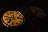 Oude klok in opengeslagen kast. Klok wordt weerspiegeld in het glas van de kast. Zwarte achtergrond.