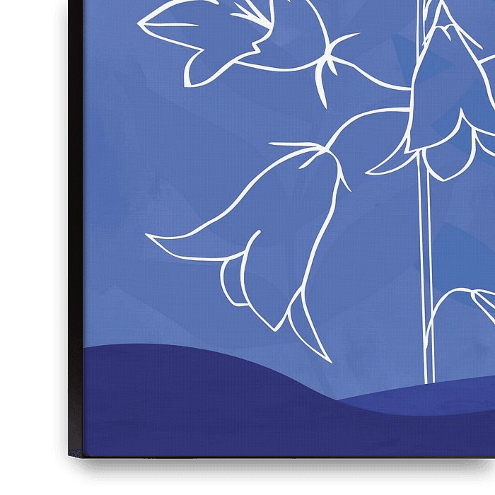 De illustratie toont een takje van campanula (klokjes) met knoppen en bloemen, allemaal met de hand getekend met alleen lijnen. Achter de bloemen gaan twee stengels met bladeren op in de achtergrond en vormen de indruk van omgevende planten.