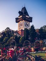 Een indruk uit Graz, Oostenrijk: De middeleeuwse klokkentoren (Grazer Uhrturm) op de Schlossberg.