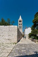 Oude binnenstad van de historische stad Rab op het gelijknamige eiland in de Adriatische Zee in Kroatië met de klokkentoren van de kerk van Maria Tenhemelopneming