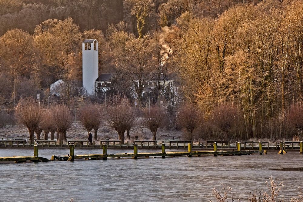 Op de voorgrond de met ijs bedekte visvijver van Valkenburg tijdens zonsopgang op een heldere winterdag (Limburg, Heuvelland, Nederland)
