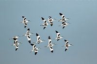 Kluten (Recurvirostra avosetta) in formatie vliegend boven het eiland Texel.